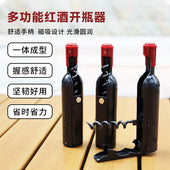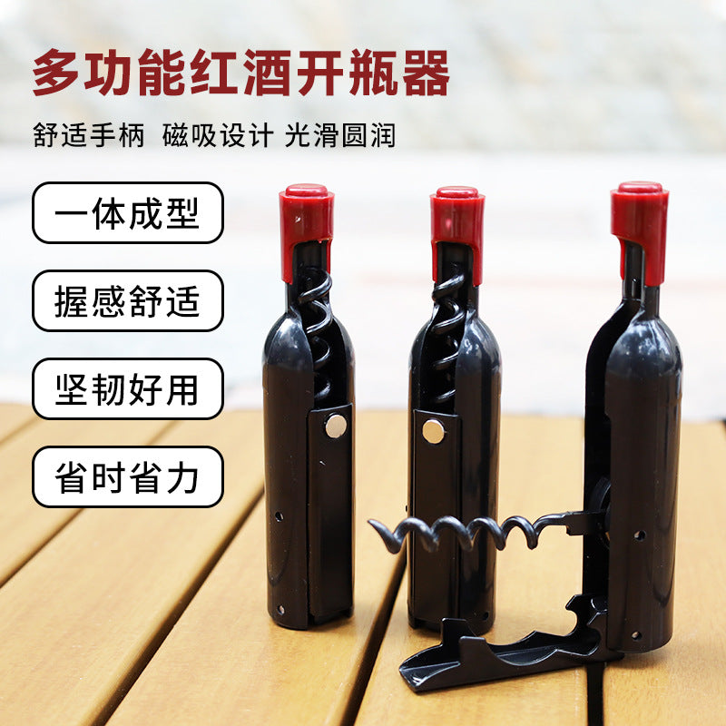 Creative wine bottle shaped multi-purpose refrigerator magnet for opening bottles of wine, beer, and other beverages. Portable bottle opener.